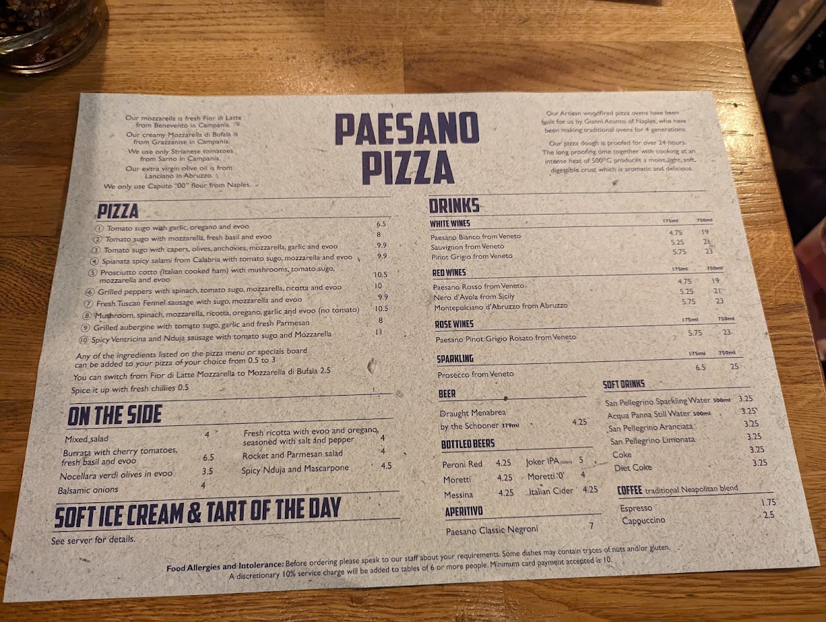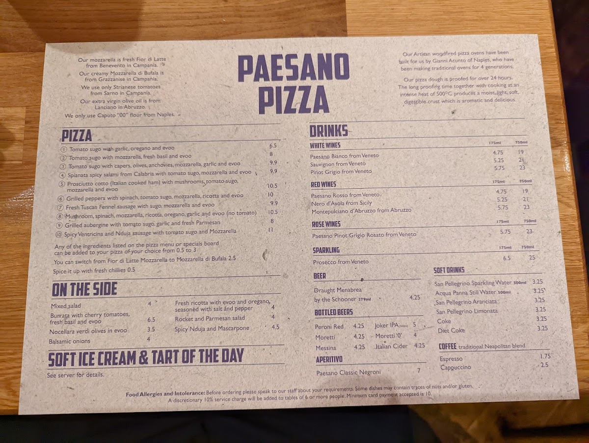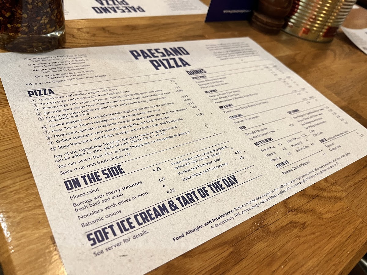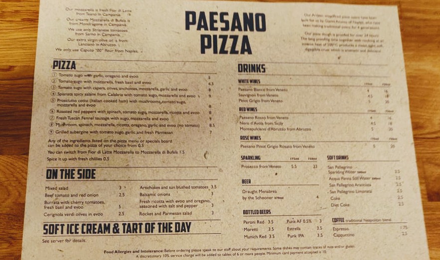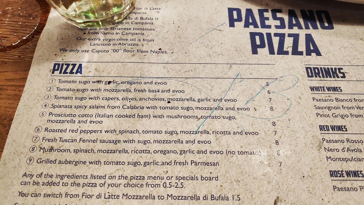 Paesano Pizza Menu